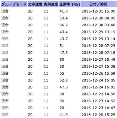 文字20wpm、実行10wpm継続中。仕事が急に忙しくなって帰宅が遅くなったり忘年会やら何やらで練習出来ない日が数回あった。一日さぼったあとのほうが正解率高かったりするから不思議だ。グラフを見ると、毎回では乱高下、週間では緩く上下、平均ではまったく…