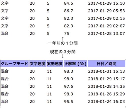 累計練習時間が24時間を超えた。一年でどれくらい上達してるのか比較。 実効5語の文字1分で合格点に届かなかったのが、実効11語の混合3分で軽く合格点に達するくらいにはなった。しかし、何度やっても満点にはならない。必ず2〜3字ミスコピーする。3分連続を…