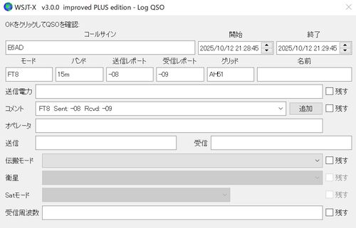 日時はJST。バンドモードは特記ない限り15m FT8 1〜4日 別宅 1日夕方のスキマ時間で3Q I、BY、UR他の日は余裕なし。 12〜18日 別宅 13日朝6時台にCQ連発していたE6ADを呼んだら1回で応答があった。このQSOからWSJT-X v3.0.0 improved PLUSを使用。 近くにし…