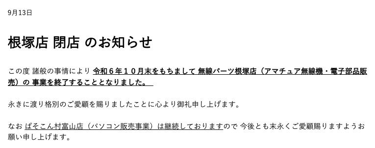 無線パーツは富山県の老舗ハムショップ。1990年代には根塚店、高岡店、金沢店があった。アマチュア無線人口の減少とともに2010年1月末に金沢店、2013年12月末に高岡店が閉店して、根塚店が最後の砦だった。当局も若者時代からかなりお世話になったし、いま別宅で使っているTS-590SGは根塚店で購入した。聞いたことのない値段で即決した。実店舗で買うメリットは価格っていうのはカムバックしてから知った。あの値引き率を知ると岐阜の通販は高すぎて使わなくなった。送料もかかるし。閉店前に行っておきたいが、たぶん行けません。長い間ありがとうございました。